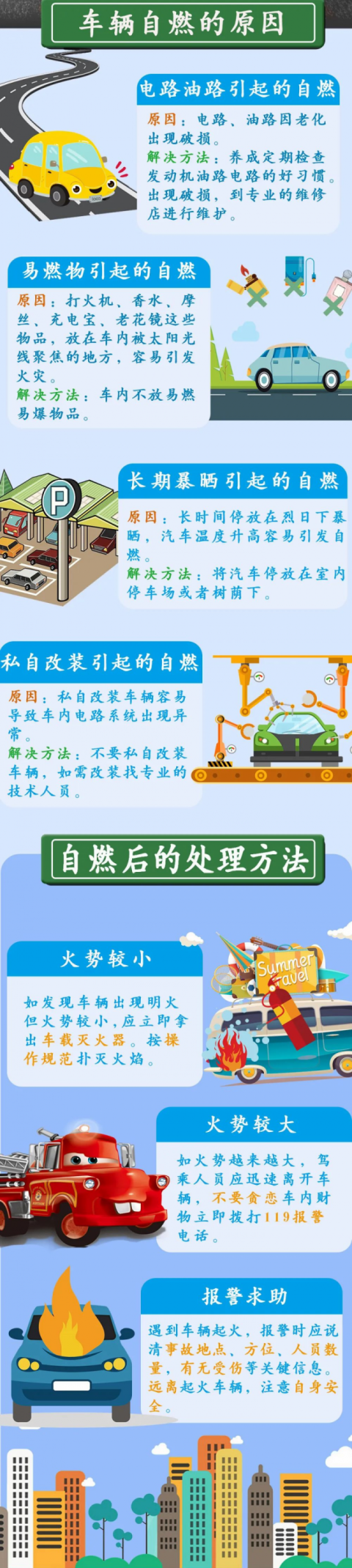 温馨提醒:通过上述案例,我们知道了汽车自燃的可怕性,那么,除了高温,还有哪些原因诱发车辆自燃呢?我们又该如何预防呢?