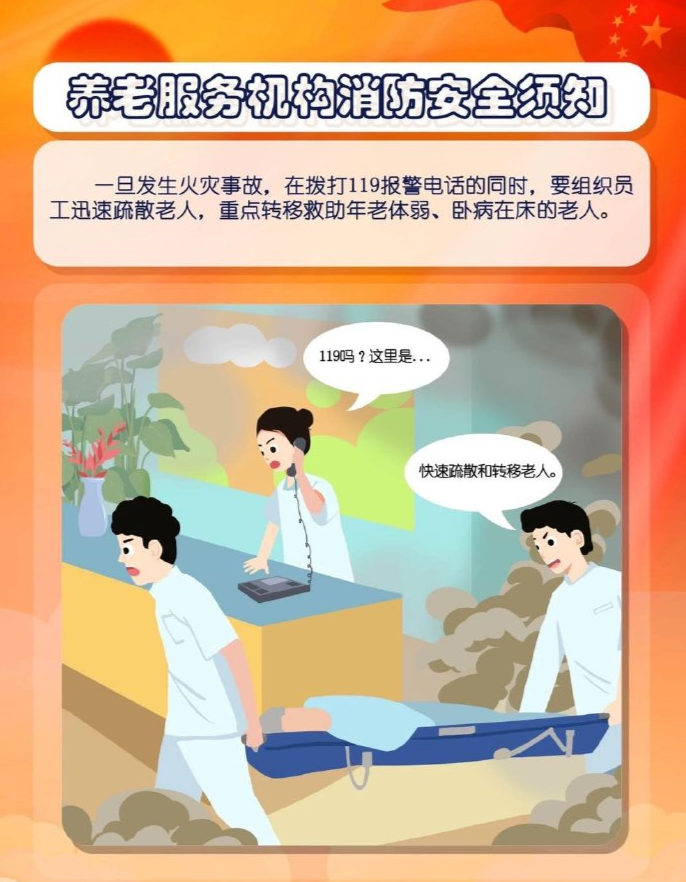 养老院一旦发生火灾事故,在拨打119报警电话的同时,要找到医养机构员工求助,迅速进行疏散撤离。