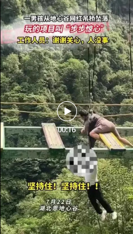 同日,湖北恩施地心谷景区,一男孩从安全设备脱出坠入山谷。23日中午,景区发文:坠落游客为10岁儿童,经初步诊断,其腰椎、胸椎骨折,头皮裂伤,暂无生命危险。目前该游乐项目已被责令关停,相关部门正在对事故原因进行调查。