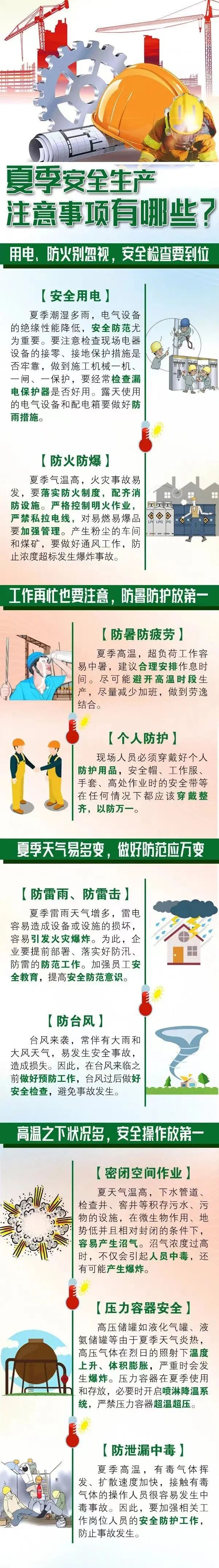 夏季,温度升高,常有雷雨、冰雹等极端天气出现,给安全生产带来了诸多不利因素。安全无小事,戳图查收注意事项