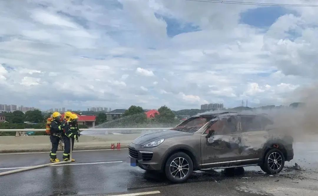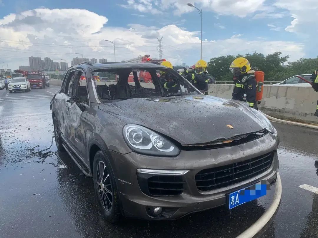 7月7日13时许,湖南长沙开福区一立交桥上,一辆私家车发生自燃,接警后,消防救援人员立即出动。