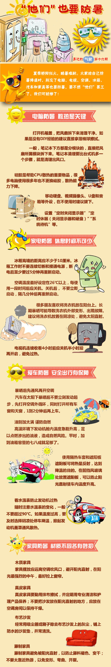 小暑一过,已经进入了三伏天,“暑伏”天里要格外注意防暑降温。炎夏已至,生活生产用电量剧增,车辆在高温下,也易燃易引发火灾,因此在夏季,家用电器的”防暑“,也十分重要,家用电器如何防暑,来一起学习。